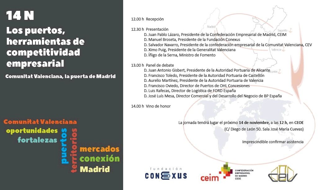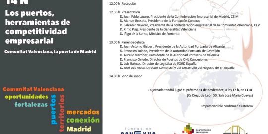 La confederación empresarial de la Comunidad Valenciana, la Confederación Empresarial de Madrid y la Fundación Conexus organizan el 14 de noviembre la jornada “Los puertos, herramienta de competitividad empresarial. Comunitat Valenciana, la puerta de Madrid”, que tendrá lugar en la Sala Jose María Cuevas de la sede de CEOE, sita en la calleDiego de León, de Madrid.