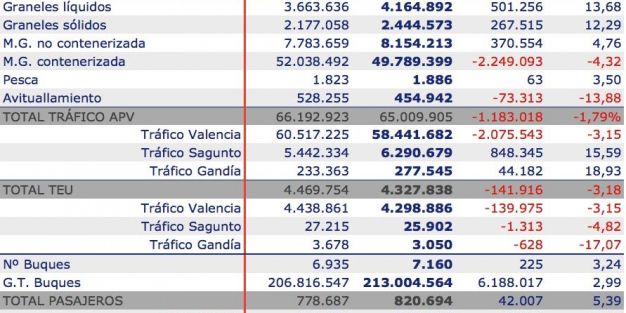 Los tres puertos gestionados por la Autoridad Portuaria de Valencia, de Valencia, Sagunto y Gandia, han canalizado un total de 65.009.905 toneladas en 2013, suponiendo un retroceso del 1,79% respecto al ejercicio anterior.