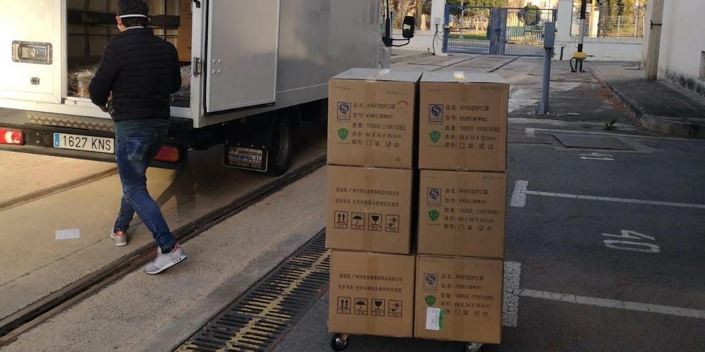 Transportes ya ha comenzado el reparto del primer cargamento de 1,2 millones de mascarillas recibidas el pasado fin de semana en Barajas.