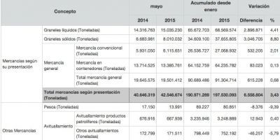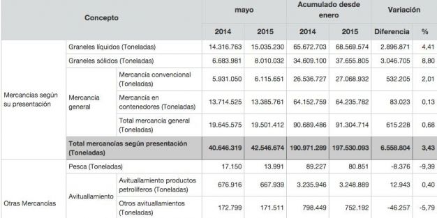 El tráfico total portuario registrado en los 46 puertos de titularidad estatal que coordina Puertos del Estado alcanzó las 202.775.920 toneladas movidas durante los cinco primeros meses del año, lo que supone un incremento del 3,1% respecto al mismo periodo de 2014.