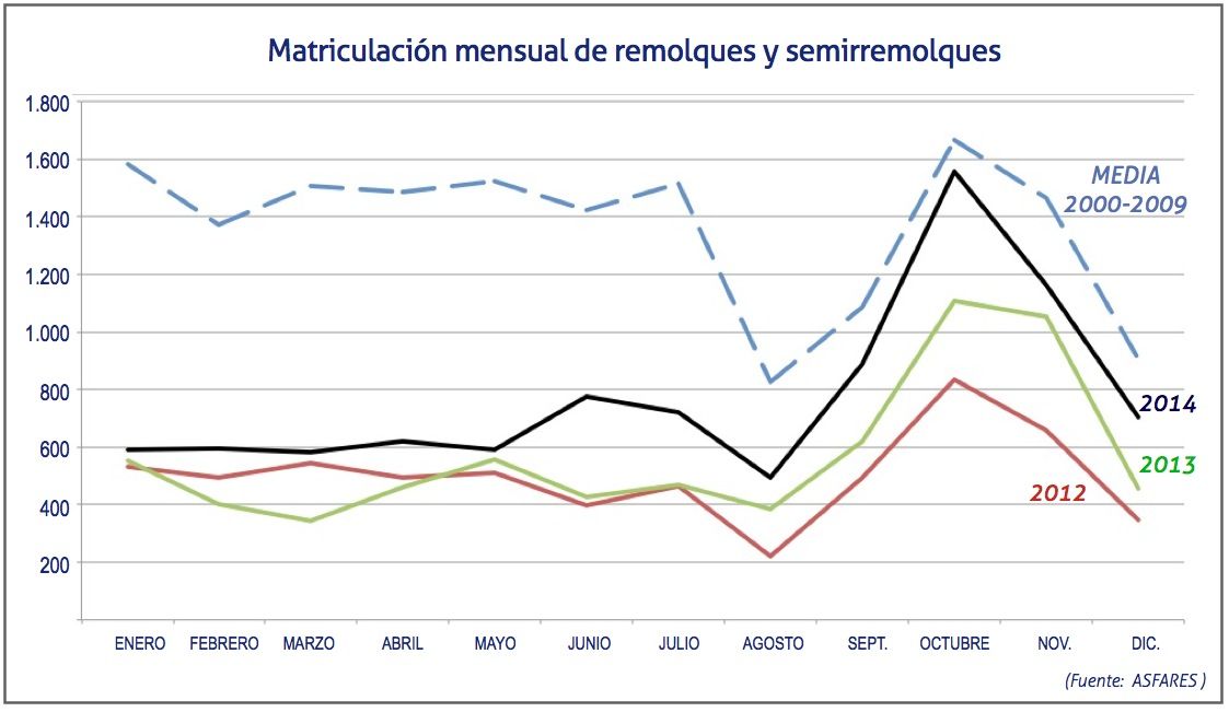 La matriculación de remolques y semirremolques de más de 12 tn, según los datos facilitados por la asociación de fabricantes ASFARES, ha sido de 9.284 unidades en 2014, lo que supone un incremento del 36% respecto de las 6.833 unidades del año anterior.