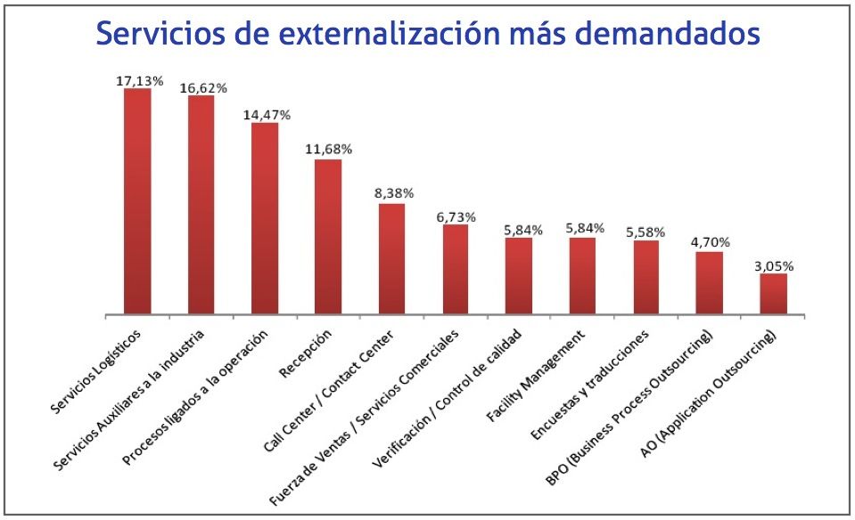 Según la IV Encuesta sobre externalización realizada por Adecco Outsourcing, el proceso de externalización más demandado son los servicios logísticos, con un 17,13% de los casos, englobando servicios de recepción, carga y ubicación de mercancías, servicios de cross-docking, co-packing, y logística inversa. En segunda posición, después de la logística, se encuentran los servicios auxiliares a la industria (16,62%). Mientras que los procesos ligados a las operaciones en el sector servicios, con un 14,47%, ocupan el tercer lugar. Así lo asegura una encuesta realizada por el Grupo Addeco sobre la externalización de las empresas.