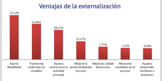 La flexibilidad y la transformación de costes fijos a variables son las principales ventajas que aporta la externalización a las empresas. Así lo asegura el 27,12% y el 21,8%, respectivamente. Además, les ayuda a centrarse en la actividad principal (para el 18,11%) y mejora la productividad del proceso (para el 11,17%).
