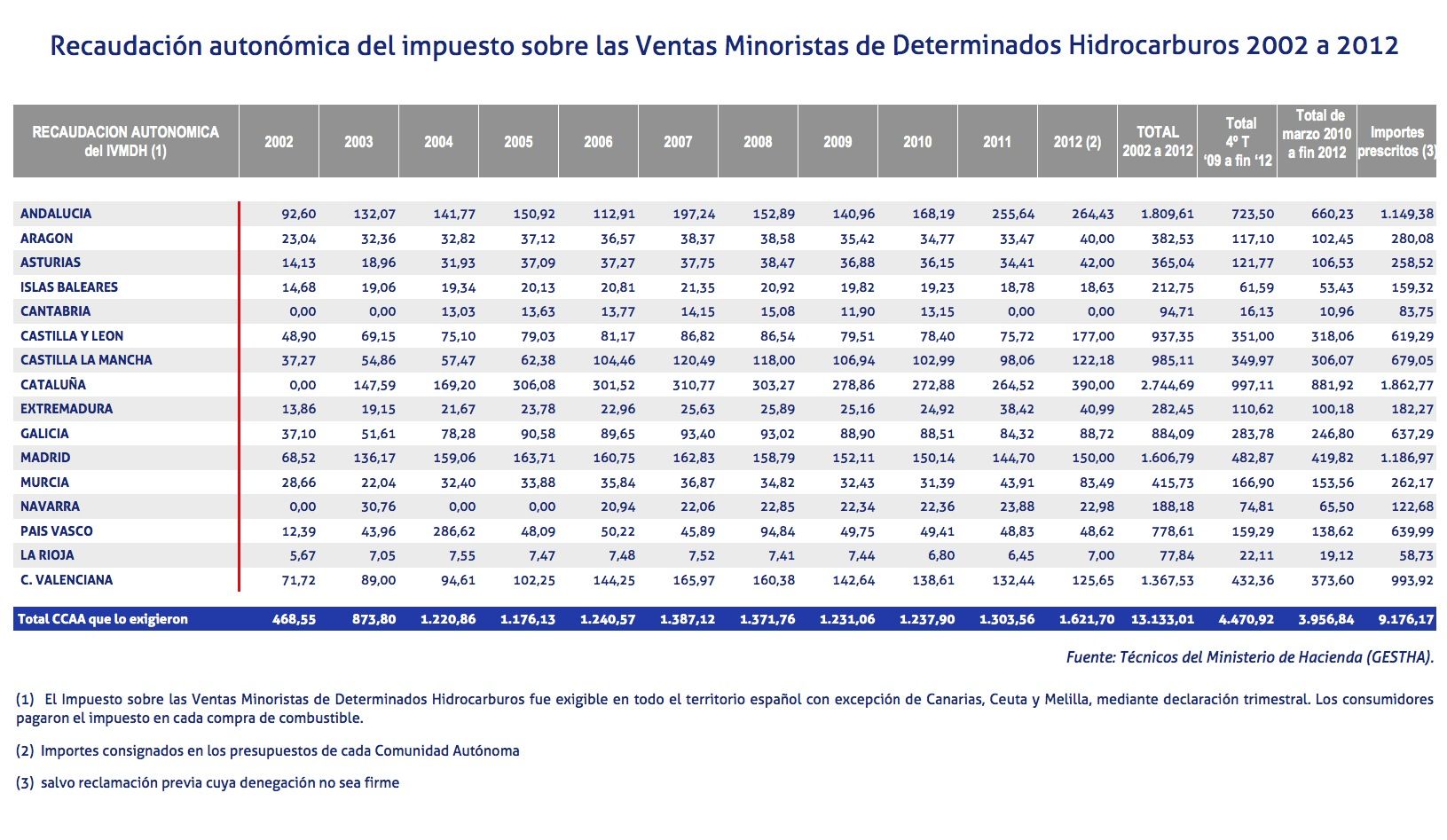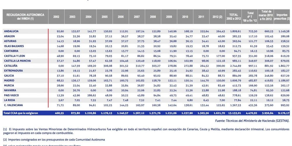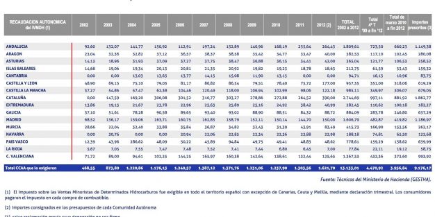 recaudacion autonomica del impuesto de hidrocarburos centimosanitario entre 202 y 2012