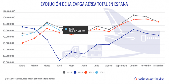 De igual manera, en los cuatro primeros meses de 2022, el tráfico total del sistema aeroportuario español suma, por lo que respecta a la carga aérea, un total de 330.485.668 kg de mercancías, un 12,1% anual más, aunque un 1,8% por debajo de los volúmenes de los cuatro primeros meses de 2019.