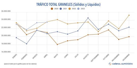 En todo el primer cuatrimestre de 2023, el sistema portuario del país totaliza 60.193.218 toneladas de graneles líquidos, un 0,3% más que hace un año, y 31.349.537 toneladas de graneles sólidos, un 3,5% anual más.
