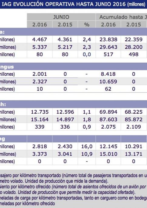 El grupo IAG ha publicado los resultados de junio de 2016, mes en el que el tráfico de mercancías, con una TKT Carga (toneladas de carga por kilómetro transportadas) de 429 millones de toneladas, asciende un 3,1% con respecto al mismo mes de 2015.