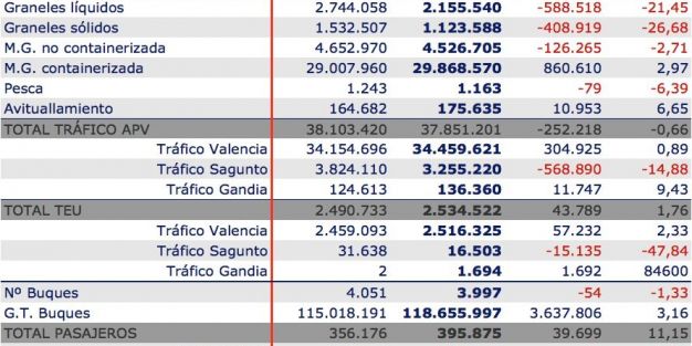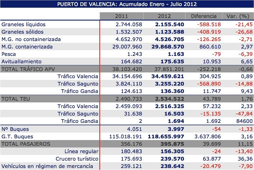 Los tres puertos gestionados por Valenciaport, Valencia, Sagunto y Gandia, han manipulado hasta el mes de julio un total de 37.851.201 tn, lo que supone un ligero descenso del 0,66%, respecto al mismo periodo del año 2011. Sin embargo, el tráfico de contenedores aumenta. En este caso, con un movimiento de 2,53 millones de TEUs, el tráfico se incrementa en un 1,76%.