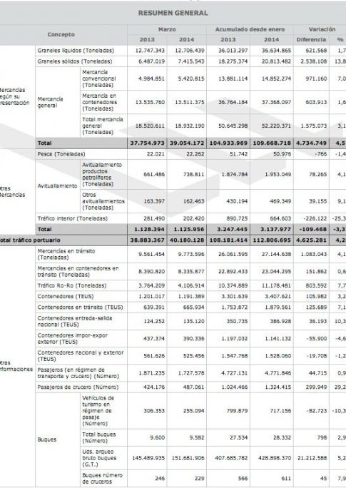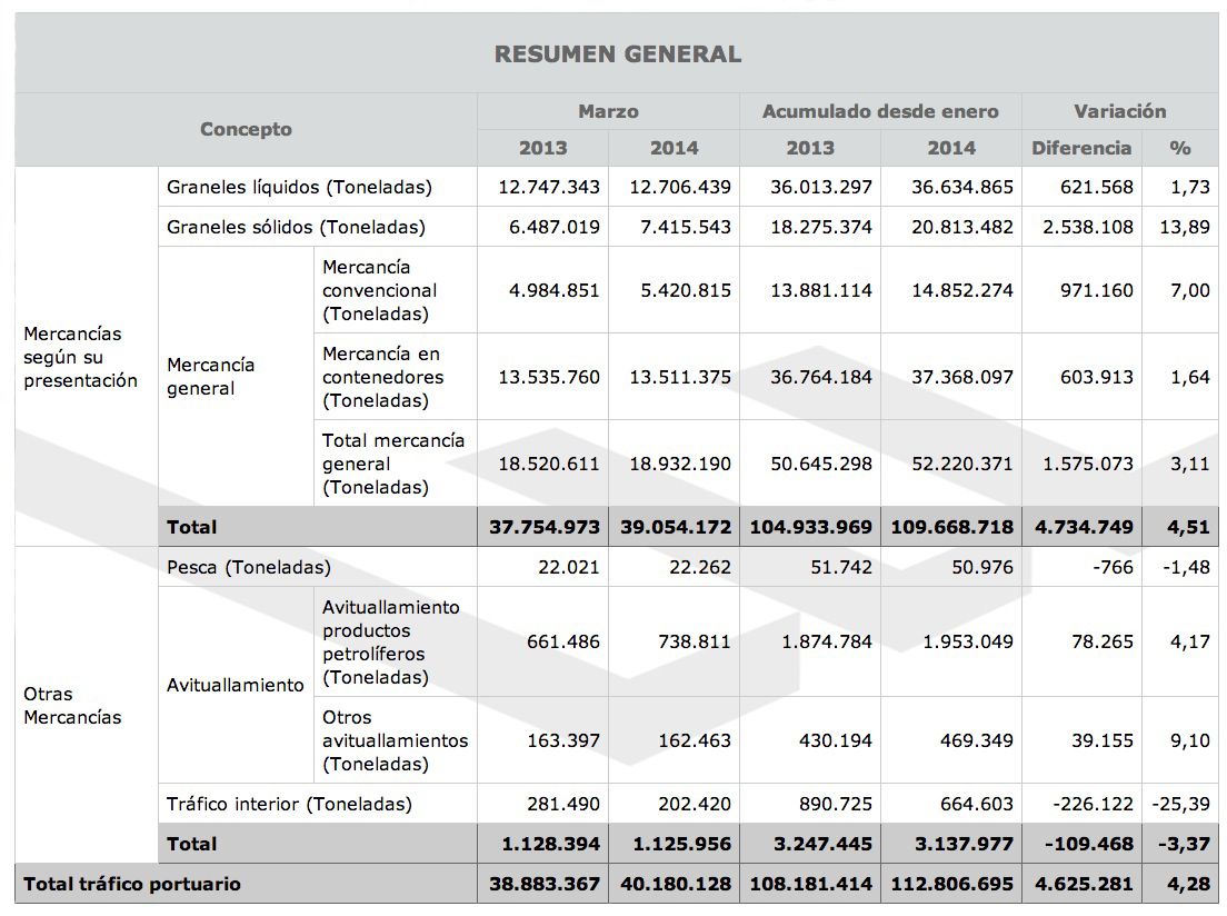 En marzo, se han movido 39.054.172 toneladas en los 46 puertos de interés general del organismo público Puertos del Estado, lo que representa un 3,4% más que en marzo de 2013. De esta forma, supera los más de 37 millones alcanzados en enero y se acerca a la cifra récord de 40,5 millones de toneladas movidas en 2008. En cuanto al acumulado, el crecimiento con respecto al mismo periodo de 2013 es del 4,28%.