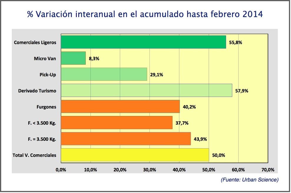 En el mes de febrero se ha registrado un aumento del 51,4% con respecto a febrero de 2013 en el mercado de vehículos comerciales, con lo que se acumula once meses consecutivos de crecimiento en este mercado.