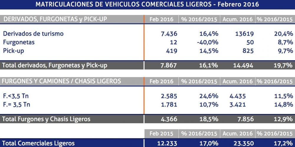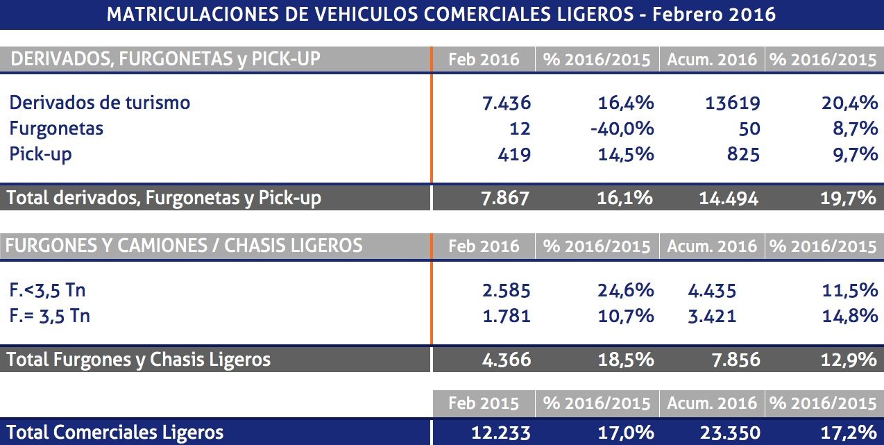 En el mes de febrero se ha registrado un aumento del 17% con respecto a febrero de 2015, en el mercado de vehículos comerciales, con lo que se acumulan ya 35 meses consecutivos de crecimiento en este mercado, según los datos publicados por Aniacam. No obstante, cabe destacar que febrero de 2016, al ser bisiesto, ha tenido un día más que el mismo mes de 2015.