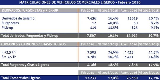 Además, en el segmento de los derivados de turismo, las matriculaciones han aumentado un 20,4% durante el presente 2016, creciendo en las pick-up un 9,7% y en las furgonetas un 8,7%.