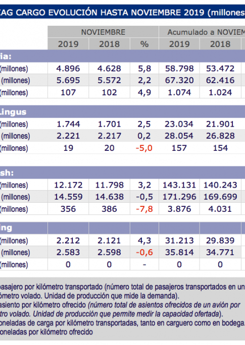 Así pues, en los once primeros meses del año, el grupo de aerolíneas acumula un volumen total de 5.119 millones de toneladas, un 1,9% por debajo del registro del mismo período del año pasado.