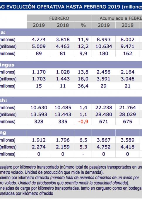 Por contra, los volúmenes de carga aérea de Iberia han crecido un 9,9% en el mes de febrero hasta los 99 millones de toneladas. y acumulan en el primer bimestre de 2019 un crecimiento con respecto al mismo período de 2018 de un 11,1%, con un volumen acumulado de 180 millones de toneladas.