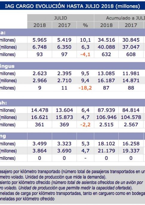 Así pues, en los primeros siete meses del presente ejercicio, el grupo IAG ha movido 3.233 millones de toneladas, un 0,9% menos que en el mismo período de 2017, cuando totalizó 3.263 millones de toneladas.