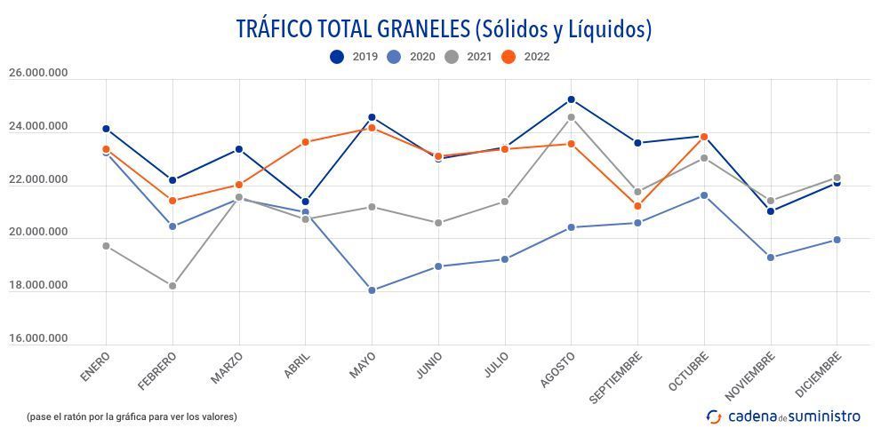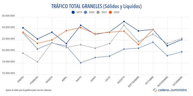 Durante el pasado mes de octubre, los puertos españoles han movido 15.022.529 toneladas de graneles líquidos, un 0,67% menos que hace un año, y 8.795.646 toneladas de graneles sólidos, un 14% anual más.