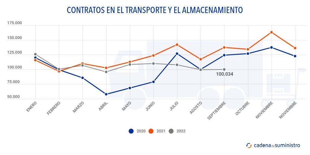 Así pues, durante el pasado mes de septiembre se han registrado 100.034 contratos de trabajo nuevos en el sector del transporte y la logística, un 27,11% menos que en el mismo mes de 2021, así como un 0,91% más que en agosto.