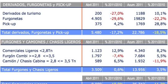 Las matriculaciones de vehículos comerciales ligeros han registrado en el primer cuatrimestre del año 2011 una nueva caída del 11,3%, con un total de 36.742 unidades vendidas. El segmento de los derivados de turismo, pick-up y furgonetas, principal segmento y más representativo de los vehículos comerciales ligeros, han sido los que han experimentado un descenso más acusado con una caída del 29,6% en el mes y del 22,2% en el acumulado del cuatrimestre.