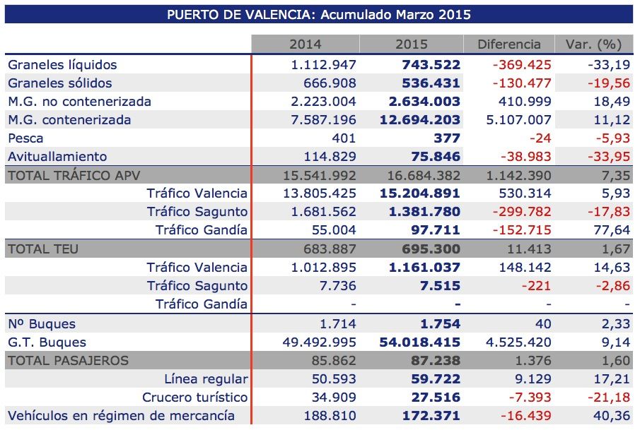 El tráfico de mercancías en los puertos gestionados por Valenciaport ha aumentado un 7,35% durante el primer trimestre de 2015 con respecto al mismo periodo de 2014, hasta canalizar un total de 16.684.382 tn.