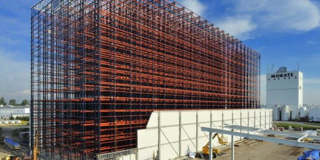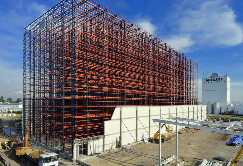 Con una capacidad de almacenaje de hasta 16.000 palets, en el centro logístico se alzan estanterías de 30 m de altura, separadas por cuatro pasillos por los que se desplazan cuatro transelevadores.