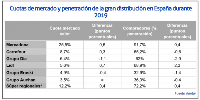 En un mercado que, a lo largo del pasado 2019, ha visto cómo aumentaba el gasto un 1%, pese a que el volumen descendía un 0,9%, Mercadona ha alcanzado una cuota de mercado en el gran consumo español de un 25,5%, seis décimas porcentuales más que en 2018, y una descomunal penetración de un 91,7%, un 0,4% anual más.