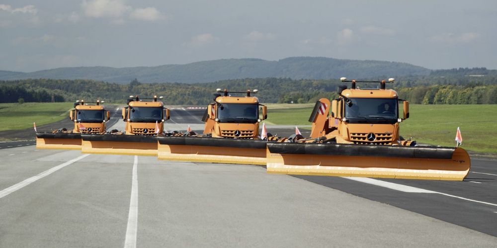 En este caso, la prueba se ha llevado a cabo con un convoy formado por cuatro tractoras Arocs 2045 AS en versión Grounder, equipadas con un motor OM 470 Euro VI de 428 CV y un par motor de 2100 Nm. Combinadas con un semirremolque configurado como quitanieves, han limpiado el suelo del aeropuerto gracias a su sistema Remote Truck Interface, RTI, para el control de los vehículos por control remoto.