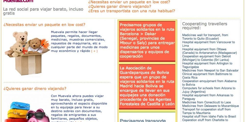 La red social 'muevala' colabora gratuitamente con las ONG que precisan enviar medicinas, equipo sanitario o envíos de cooperación hacia países en desarrollo, relacionando a las ONG con grupos de viajeros solidarios que en la misma ruta, se encargan de transportar en los equipajes del grupo la carga solidaria.