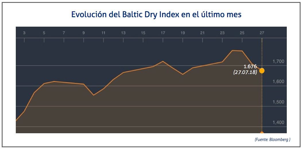 El Baltic Dry Index, BDI, que refleja los precios de los fletes de los buques graneleros tomando como referencia un total de 23 rutas marítimas, ha descendido el viernes 27 de julio de 2018 hasta los 1.676 puntos, lo que supone una caída de 32 puntos o del 1,87%.