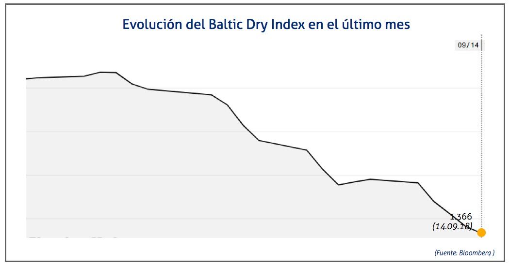 El Baltic Dry Index, BDI, que refleja los precios de los fletes de los buques graneleros tomando como referencia un total de 23 rutas marítimas, ha caído el viernes 14 de septiembre de 2018 hasta los 1.366 puntos, lo que supone un descenso de 16 puntos o del 1,16%.