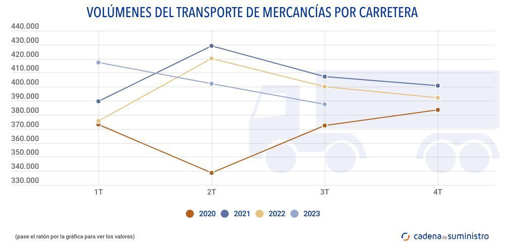 De julio a septiembre de este 2023, en España se han movido por carretera un total de 387.624.570 toneladas de mercancías, registro que supone un descenso de un 3,13% con respecto al mismo período de 2022.