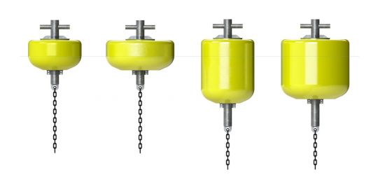 En total hay cuatro flotadores disponibles con diámetros de 1250 mm y 1600 mm y volúmenes entre 700 y 2500 litros. Además, cada modelo está disponible con cuatro diseños de bita de amarre.
