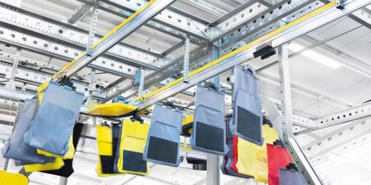 Asimismo, se han aplicado diferentes innovaciones y tecnologías. Se usa un sistema de transporte aéreo con carriers estándar aptos para ser equipados con transponders RFID. Gracias al empleo de este sistema de transporte económico y fiable que tradicionalmente se usa para la distribución de prenda colgada, es posible alcanzar rendimientos elevados.