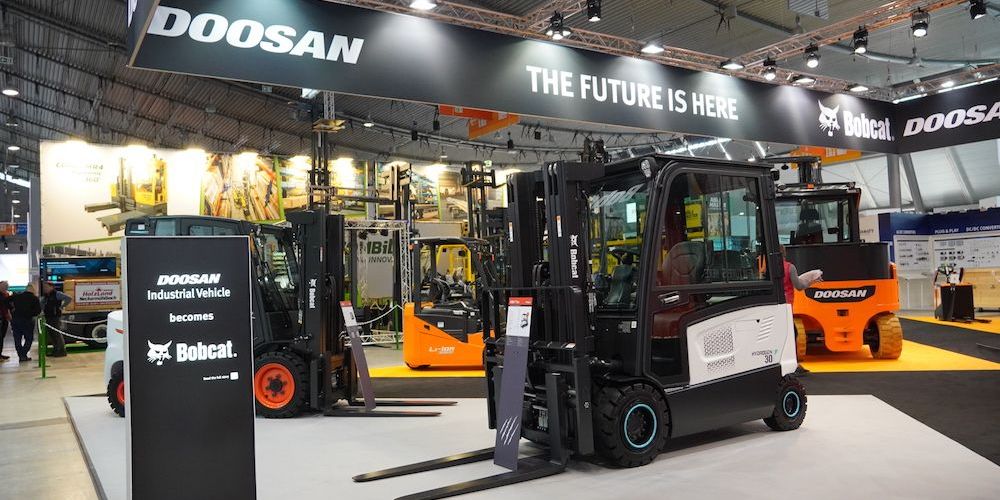 La presencia de varias máquinas mostradas en colores Bobcat en la feria LogiMAT está en consonancia con el reciente anuncio de Doosan Bobcat de que las líneas de productos de carretillas elevadoras y de generadores de energía de la empresa pasarán a formar parte de la cartera de productos Bobcat.