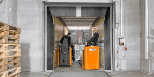 Las transpaletas son especialmente manejables en pasillos de estanterías estrechos, y resultan ideales para su uso en la carga y descarga de mercancía, merced a que su sistema de tracción en las cinco ruedas garantiza una tracción óptima y una gran estabilidad lateral, incluso en suelos irregulares.