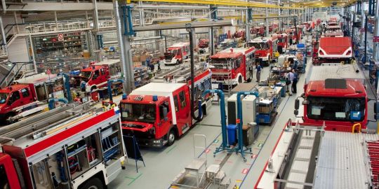 La producción de los camiones escalera y antiincendios se ha concentrado en estas renovadas instalaciones, que emplean a 1.050 personas y han recibido una inversión de 35 millones de Magirus.