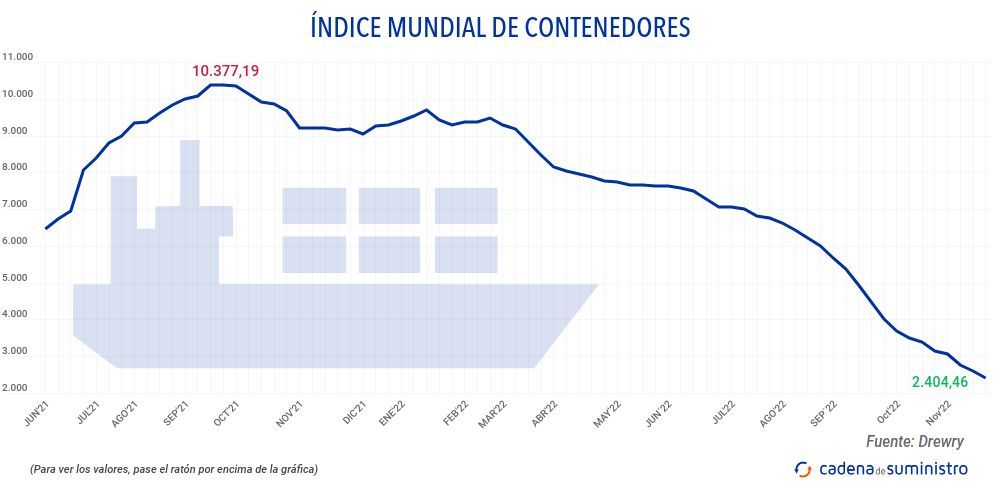 El Índice Mundial de Contenedores elaborado por Drewry, que evalúa las tasas de carga de contenedores en las ocho rutas principales hacia y desde Estados Unidos, Europa y Asia, se ha reducido un 7% en la última semana, con 2.404,46 dólares/FEU (2.312,06 euros). El índice suma ya 39 semanas consecutivas a la baja y se sitúa un 74% por debajo del nivel del año anterior por estas fechas y un 77% por debajo del máximo de 10.377 dólares (9.978 euros) alcanzado en septiembre de 2021. También se encuentra un 36% por debajo de la media de los últimos cinco años, situada en 3.768 dólares (3.623 euros). Los precios entre Shanghái y Génova se han reducido en un 5%, llegando a los 3.221 dólares (3.097 euros), mientras que en las líneas entre Shanghái y Rotterdam han caído un 18%, hasta los 2.192 dólares (2.108 euros). Por su parte, entre Shanghái y Los Ángeles han retrocedido un 3% hasta los 2.069 dólares (1.989 euros), y entre Shanghái y Nueva York han descendido un 4% hasta los 4.846 (4.660 euros). En cuanto a las conexiones entre Rotterdam y Nueva York, las tasas de carga han caído un 2% hasta los 7.224 dólares (6.946 euros). Desde la consultora, creen que los precios mantendrán esta tendencia a la baja en las próximas semanas.