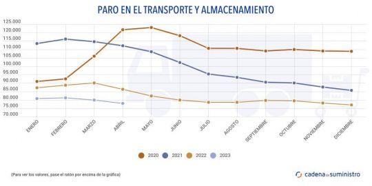 De la cifra total de parados en el sector logístico y de transporte, según las últimas estadísticas oficiales, 39.892 parados corresponden al transporte terrestre, un 2,41% menos que hace un mes, y 2.236 al transporte marítimo, un 3,75% mensual menos.