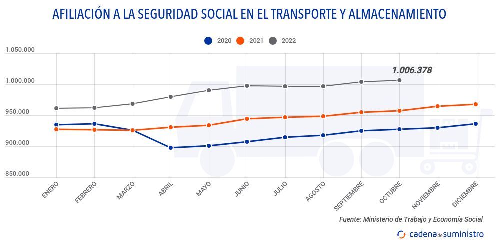 Entre los afiliados al Régimen General y al especial de Autónomos, en octubre han cotizado a la Seguridad Social un total de 1.006.378 trabajadores en el sector de transporte y logística en España, un 0,2% más que en septiembre, es decir, 1.983 personas más.