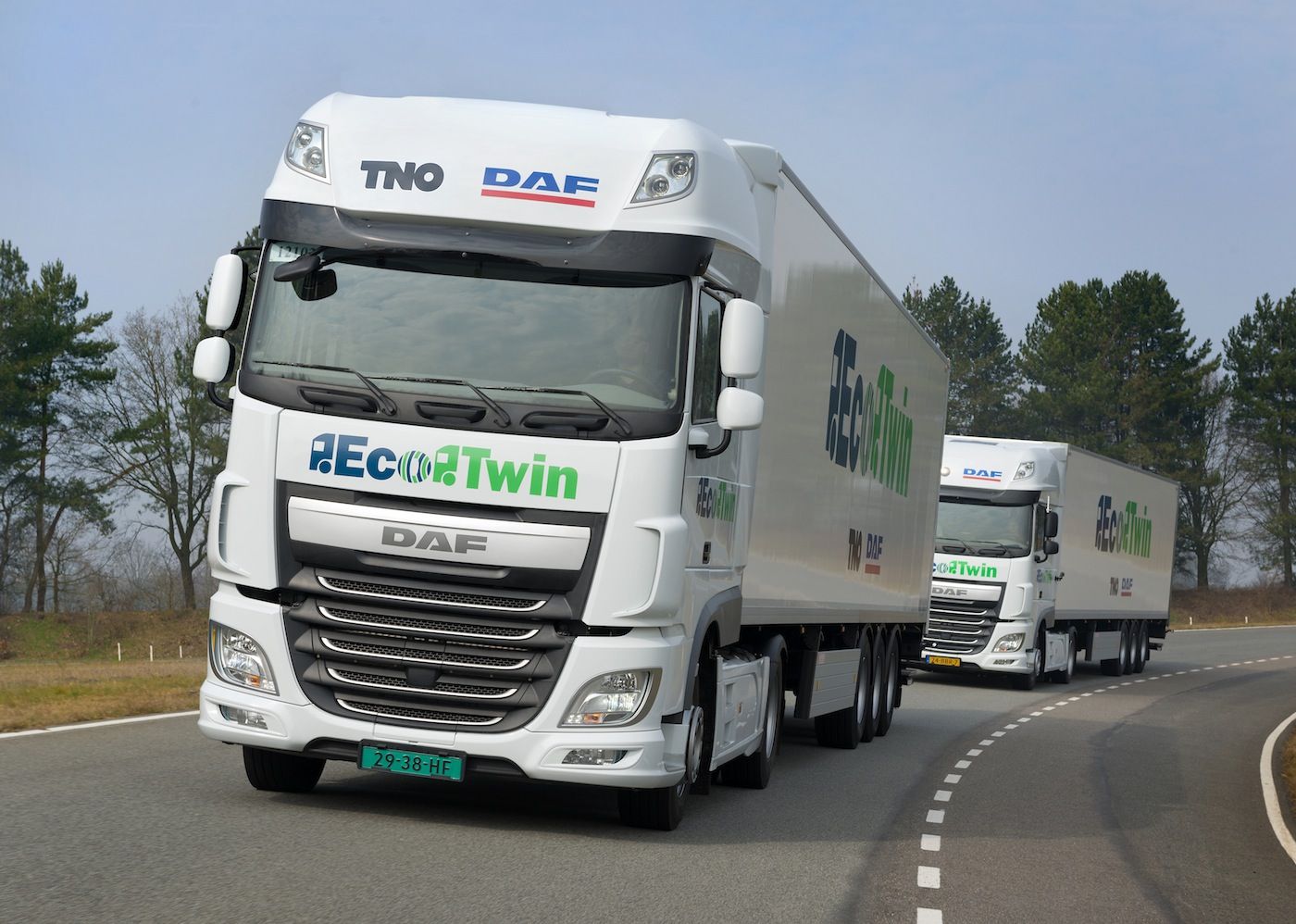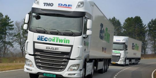 DAF ha presentado recientemente a la administración holandesa, en primicia, su nuevo proyecto 'EcoTwin', por el que una conexión inalámbrica vía wifi conecta a dos camiones y permite al segundo emular, si circula a corta distancia del primero, la aceleración, la frenada y los cambios de dirección de este de forma automática.