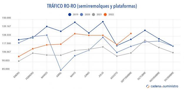 Por lo que respecta al tráfico de remolques, semirremolques y plataformas en régimen ro-ro, durante el pasado septiembre, Valencia ha movido 29.911 unidades, un 3,59% anual más.