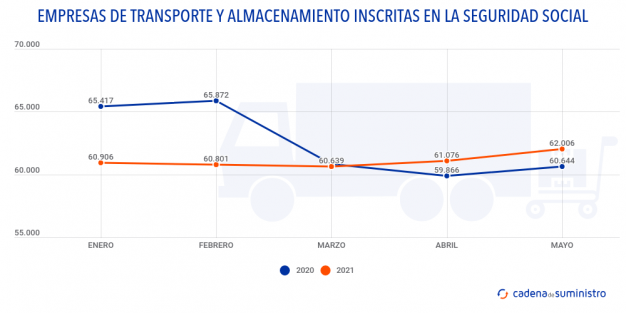 El número de empresas de transporte y almacenamiento inscritas en la Seguridad Social se mantiene al alza, de tal modo que, a finales del pasado mayo, el sector cuenta con 62.006 empresas, un 1,52% más que en abril, así como otro 2,25% más que en el quinto mes del año pasado.