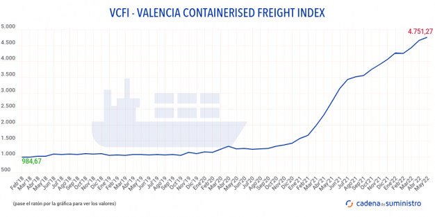 El Valencia Containerised Freight Index, VCFI, ha vuelto a crecer el pasado mes de mayo con una subida de un 2,09% con relación a abril, hasta alcanzar un valor de 4.751,27 puntos.