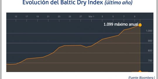 El Baltic Dry Index (BDI), que refleja los precios de los fletes de los buques graneleros tomando como referencia un total de 23 rutas marítimas, ha alcanzado el 13 de marzo los 1.099 puntos, su nivel más alto en los últimos tres meses, registrando aumentos en todos los segmentos de buques, salvo en los panamax.