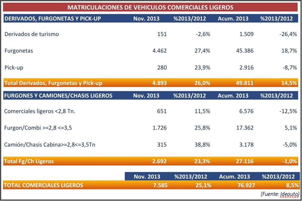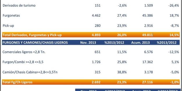 En el mes de noviembre se perciben signos positivos en todos los segmentos, menos en las matriculaciones de los derivados de turismo, con un 2,6% menos que en noviembre de 2012. En el acumulado del año, este segmento cae un 26,4%, con 1.509 vehículos matriculados.