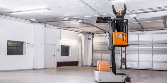 El preparador de pedidos OCV reduce la velocidad en las curvas y bloquea las puertas cuando la plataforma se eleva, mientras que en los cruces se acerca proyectando una luz de seguridad y emitiendo un tono de advertencia cuando el operario está descendiendo de la plataforma.