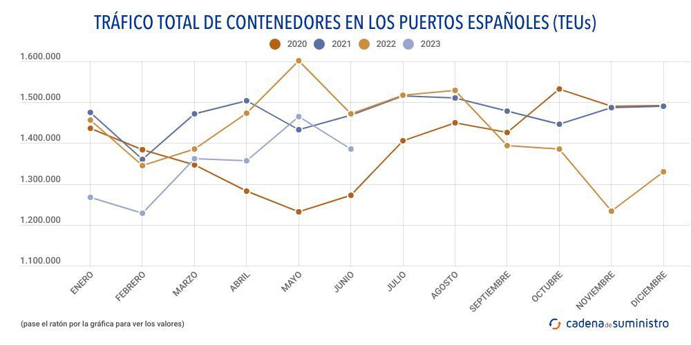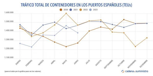 En detalle, 699.602 TEUs corresponden a contenedores en tránsito, un 2,76% anual menos, mientras que 174.569 TEUs corresponden a entradas y salidas nacionales, un 7,49% menos que en junio de 2022, y 510.565 TEUs a import-export exterior, lo que se traduce en un descenso anual de un 9,82%.