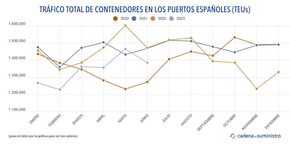 Durante el pasado mes de junio, el sistema portuario español ha movido 1.384.733 TEUs, un 6,07% menos que en el sexto mes del pasado 2022.