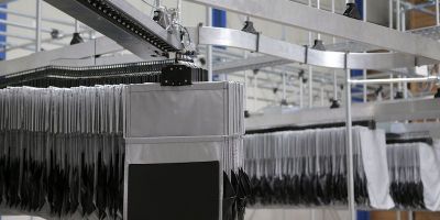 Este nuevo sistema cuenta con una bolsa de plástico que permite un almacenamiento, tanto de prendas como de cajas, que se transportan colgadas hasta la zona de picking dinámico por encima de las estaciones de envasado automático. Además, se puede acceder directamente a las prendas si una orden es cancelada por el sistema de gestión de almacenes.