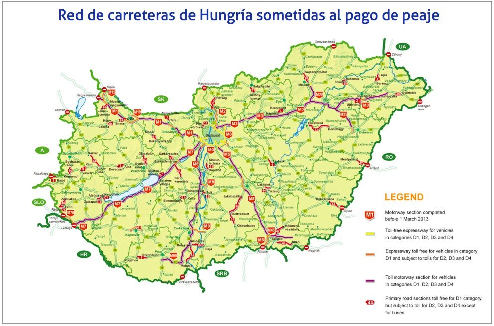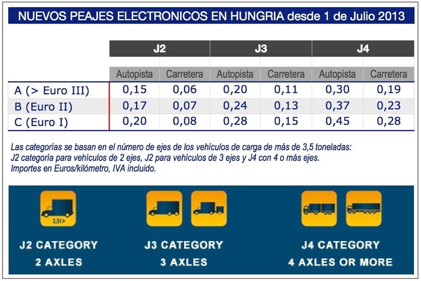 Hungría que cuenta con una euroviñeta basada en criterio de tiempo de utilización de las carreteras, introduce ahora estos nuevos peajes electrónicos recurriendo al criterio de quien usa y contamina paga, para financiar la expansión de su red de autopistas rápidas. El pago de los peajes electrónicos será obligatorio a partir de la fecha indicada, para todo vehículo de más de 3,5 toneladas y las tarifas dependerán de la categoría del vehículo y de la clase Euro en la que se encuadre.