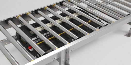 Spm Interroll está formado por varios módulos. El elemento principal es la unidad móvil, que tiene por debajo un transportador no accionado y es capaz de mover las paletas que están sobre él. También dispone de un carro de transferencia que se mueve por un raíl y puede transportar paletas entre secciones paralelas de transporte.